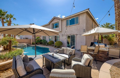 Indulge in luxury with 90day+ stay in the heart of Summerlin S. This fully remodeled 6-bedroom, 4-bath home, including 2 primary suites with private baths, is nestled in a serene cul-de-sac. Enjoy cooking extravagant meals for loved ones in the chef’s kitchen. Soak up the sun and plunge into the saltwater pool, or enjoy the beautiful skyline from the hot tub. Work from home in comfort with electronic desks. Accommodating up to ten guests, this home offers privacy and spaciousness. Just 20 minutes from the Strip, steps from Gardens Park, and 4 minutes from Downtown Summerlin Mall and Red Rock Casino, this home is ideal for families, relocations, staff housing, nurses, digital nomads, and those looking to explore Las Vegas like a local.
