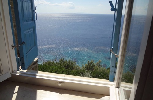 Entering from the main entrance to the living room we find ourselves in a huge circular covered terrace with an endless view in front the sea as far the eye can see while to the left you see the island's jagged shores.