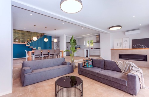 New built Villa Aria is located in Kaštel Gomilica village offering amazing views of the coast, sea, and valley in a very quiet environment. Perfectly located to get to the beach, supermarkets, restaurants in 5 min drive, and to visit historic attractions and famous locations in up to 20 min drive (Trogir, Split, Solin, Klis). This modern and very comfortable villa is newly built and fully equipped with all a modern guest needs for a perfect vacation. Offers 5 bedrooms with en-suite bathrooms, a spacious living and dining area with glass walls toward the pool area, and amazing sea views from every corner of the property. The pool and sun deck area is not overlooked, it is surrounded by palm and olive trees, and there is also a summer kitchen with an outdoor dining area next to it.