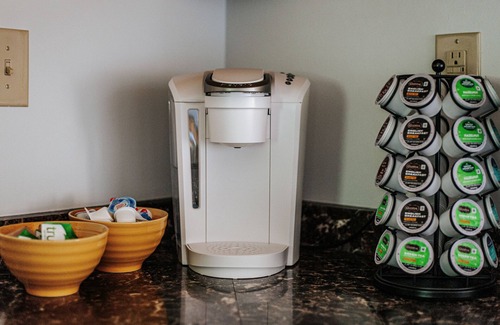 • Kitchen: Full kitchen with appliances, cookware, and coffee maker