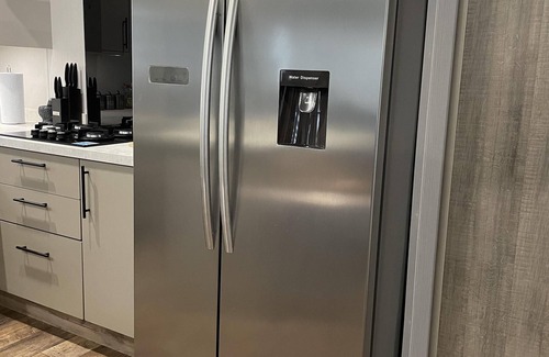 The kitchen has an American style fridge freezer , gas hob, oven, kettleand microwave.