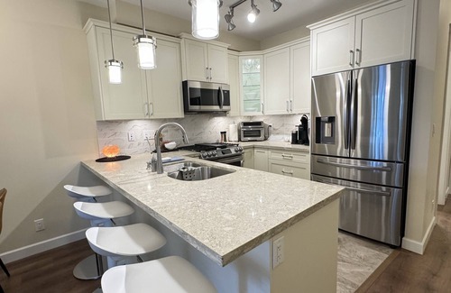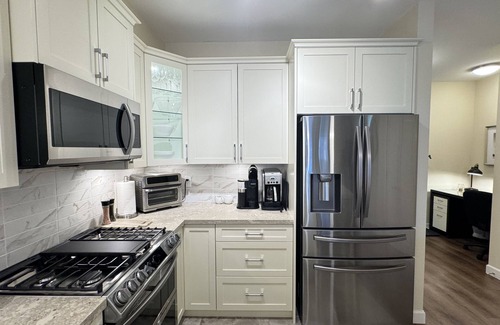 Experience cooking in a modern gourmet kitchen with beautiful quartz counters, high-end appliances including a 5 burner gas cooktop, 2 convections ovens, fridge/freezer combo with water and ice, dishwasher and microwave. The kitchen is fully stocked with the following: porcelain dishes, kids dishes, cutlery, storage containers, pots and pans, blender, rice cooker, panini grill, coffee maker, Keurig, coffee grinder, toaster over/air fryer, hand mixer, and electric knife- just to name a few. Enjoy eating at the breakfast bar (with 4 adjustable stools) or at the glass dining table.