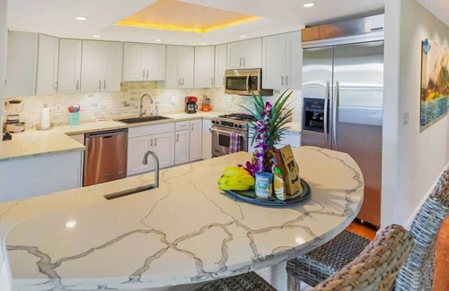 Enjoy the sound of the ocean waves, watching for sea turtles and whales, while admiring incredible sunsets & sunrises in this two-story, oceanfront condo. A beautiful corner unit, Kapaa retreat with a large lanai and built-in grill that overlooks the palms, mountains, and the ocean. Newly Remodeled Kitchen & flooring throughout. Take advantage of an exclusive gated community with access to a beautiful shared oceanfront pool. ALSO NOTE THERE IS A 10% LIMITED DISCOUNT IF STAYING 7+ DAYS!