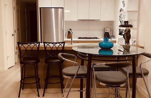 This is a beautifully furnished contemporary executive suite with a a large balcony and a spectacular river view located at the most prime location in the heart of downtown Calgary. The master bedroom includes en-suite bathroom with glass door shower. The bright open living room is connected to a full modern kitchen featuring a great size dining counter top, double under-mount sinks, stainless steel appliances & gas range oven. 1 underground parking stall and an underground storage locker are included. Kitchen has all appliances you need including coffee maker and toaster. Towels and other bathroom supplies are also provided. Free high speed Wifi and TV are also provided.