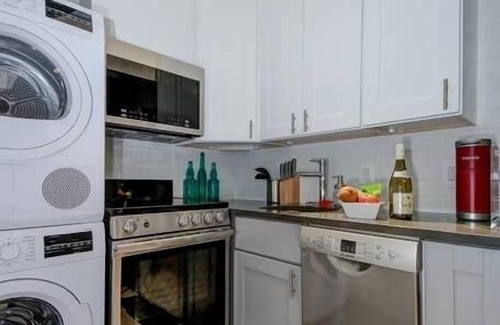 This Suite offers hardwood floors, high ceilings, and designer bathrooms, along with central air and heat for year-round comfort. Enjoy a fully equipped modern kitchen with an induction stove, microwave, dishwasher, and in-unit washer & dryer.