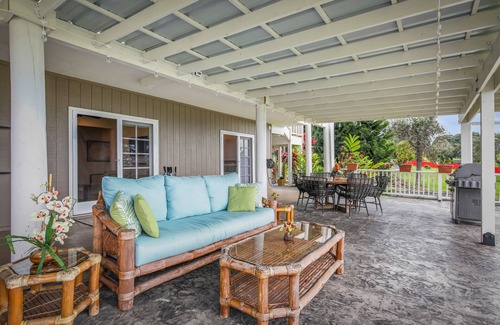 Located on the mountain of Hualalai, retreat to this gated five acre farm. High above the heat of Kona coast but conveniently positioned near the airport, town and beaches. Arise from a tranquil night’s sleep to the song of the island’s delightful birds. Enjoy a cup of coffee on the lanai or while strolling the lush grounds. After a day exploring all the Big Island has to offer, unwind with a view of the coffee trees while experiencing a breathtaking Hawaiian sunset. Sleeps up to nine.