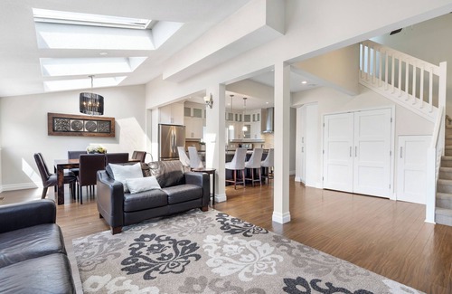 A short stairway leading down from the main level is blocked off, separating the main living space from a private lower-level suite that is not accessible to guests. The owners lives in the basement suite of the property, completely separate from the rental portion.