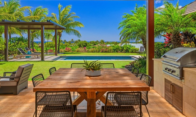 Inspired by the views of the rolling green of the golf course and the blue of the Pacific ocean, Architect Stephen Green designed Hale Kai Lani to embrace island living in a truly exceptional way, with sliding glass doors on either end of the great room open up to the lush, tropical outdoors. The gentle breeze flows through the living room and gourmet kitchen to an outdoor oasis of verdant lawn, areas for gathering and relaxation, an inviting pool, spa, and an outdoor kitchen. A shady arbor keeps the outdoor spaces cool, while generating electricity with integrated solar panels. From the master suite, step out onto the private lanai, or enjoy a refreshing outdoor shower. The main home's two additional rooms are spacious and perfect for family and friends. A one-bedroom/one-bath detached `ohana creates additional space for guests and enjoys its own private courtyard surrounded by lava rock walls.