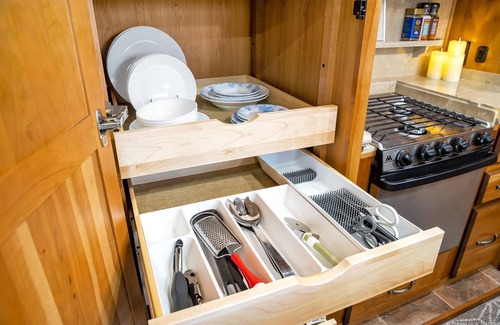 a full sized kitchen with dishwasher, washer, dryer; shower and toilet.