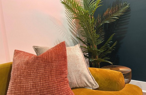 Kick back in a chic living room with bold design, plush seating, and a 65” LED-lit TV— perfect for movie nights, game days, or just good vibes with family or friends.
