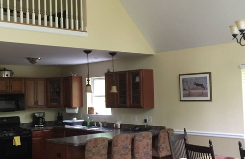 Enjoy all this Northern Pocono community has to offer while staying at this luxury Masthope Mountain 4BR Chalet. You are guaranteed to see a deer in your own backyard. Masthope Community is an all-year round community with a 250 acre spring fed lake for swimming, boating, water-skiing, and fishing. The community boasts an olympic size swimming pool with water slides and a kiddie pool area. You can also enjoy tennis, basketball, handball, bocce ball, horseshoes, shuffleboard and more. Masthope has hiking trails and horseback riding. In the winter, you can ski at Masthope's own Ski Big Bear area with 18 trails, five lifts, with skiing, snow boarding and tubing. Home is less than 5 minutes from ski mountain. Main living room features cathedral ceilings with floor to ceiling windows that lead out onto a wrap-around deck with patio seating. House features central A/C, ceiling fans, WiFi and internet service. Main living room features a 55 in. LCD tv with blue ray disc player. All 4 bedrooms have LCD tv's on wall, cable and dvd players. Bedroom 1 features Queen size bed and a full size dresser and closet. Bedroom 2 features a Queen size bed and a twin size bed and small dresser and closet. Bedroom 3 features a Queens size bed and a twin size bed and full size dresser and closet. Bedroom 4 features a King size bed and a full dresser and closet. Loft features a daybed with 2 twin beds. Basement has a Queen size Futon.
