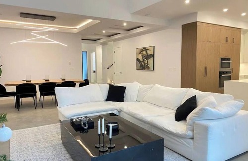 The stunning entertainer living room with 20ft ceilings include a large dining area with seating for 8, a cloud couch seating for 8, 75" tv, Nano bi-folding doors span across the back of the home providing the perfect indoor-outdoor space for entertaining. The large area includes two kitchens; the chef’s kitchen is fully equipped with a built-in fridge freezer, stainless steel appliances, gas stove, dishwasher, wine fridge and a large marble waterfall island with seating for 6. The butler’s kitchen is fully equipped with stainless steel appliances, fridge, dishwasher and a sink.
