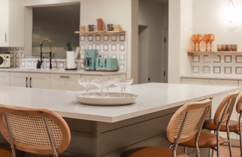 As you enter Peach house you will be greeted with a large open light fulled kitchen and dining area boasting a large 12 person table allowing everyone to be able to eat together! The kitchen is fully stocked with all appliances and cookware that you should need to be able to cook up a big meal!