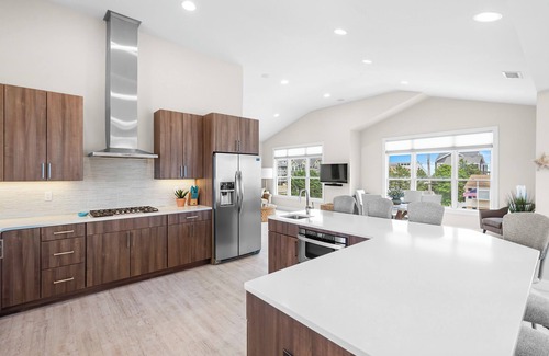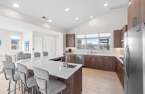 This spacious, newly built home was designed for comfort, convenience, and indoor/outdoor living. The reverse floor plan places the main living space on the top floor to maximize the incredible ocean and lake views. You’ll love the bright, open-concept kitchen with a huge island (seats 7+), perfect for group meals and entertaining. The adjoining living room has vaulted ceilings, recessed lighting, built-in speakers, and water views all around. The primary suite is also on this level, along with a stylish half bath.