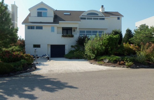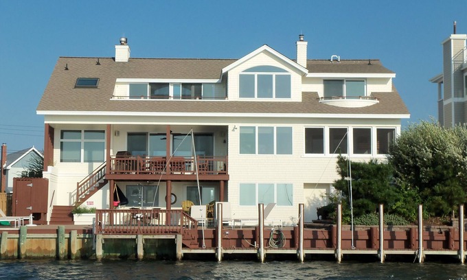 This is the perfect house for a large family or for two families to share. The first floor has 3 bedrooms (a Queen room near a separate small room containing a crib, another queen bedroom, and a double bunk bed room) 2 full baths and family room with a ping pong table, TV area. The second floor is the main living space---kitchen, dining area over looking the water, sitting area, library, half bath, porch and dining deck. The third floor has 3 bedrooms (master suite with office and private balcony and king-sized bed, large walk-in closet and large bathroom, 1 queen bedroom and another king bedroom, each with small private balconies that share a bathroom.