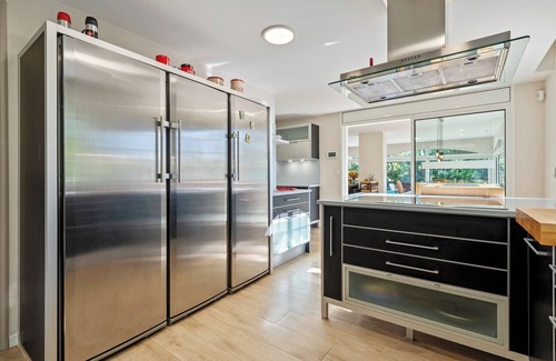 The kitchen has: An oven, microwave, dishwasher, very large ceramic stovetop, 3 different coffee makers, 2 large refrigerators, 1 large freezer, a toaster, a kettle, an endless supply of dishes, kitchen and table cutlery, serving platters, salad bowls, Tupperware, oven mitts, tea towels, paper towels, paper napkins, tall and short glasses, wine glasses, spirits glasses, coffee or tea cups of various sizes, dishwasher tablets, dish soap and hand soap, a complete set of pots and pans, children's tableware, and a large pantry.