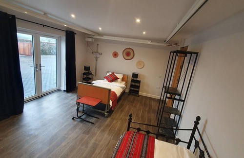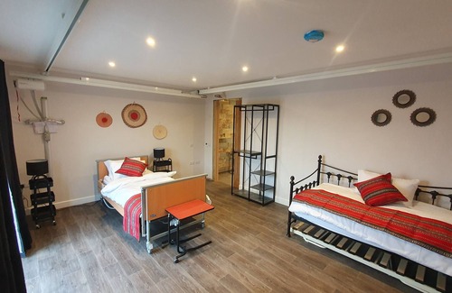 This specialist bedroom boasts a profiling bed, looped tracking hoist from bed to wet room with H frame in the bathroom. There is an additional single bed, sliding door access, wardrobe, vanity unit and stool, patio door, blackout curtains and luxury bedding. The en suite is a wet room based on changing places design with wet room shower, drop-down shower seat, changing bench, wheelchair accessible sink, high toilet and grab rails.