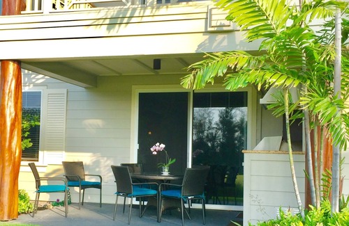 Luxurious ground floor "no stair steps" villa with private lanai, large lawn area and wide open views of the golf course. Granite slab counters in the large, well-equipped kitchen. Living and dining areas have hardwood floors. Kitchen, entry and baths have tile floors. New entertainment center with a 55" 4K TV and many different board games. New sectional sofa and new mattresses in both bedrooms. We stock supplies for your whole stay, not just tiny amounts for the first few days. The lanai has dining for 6 plus a Viking grill and sink in the outdoor kitchen. The garage holds sand chairs, snorkel gear, beach towels, boogie boards, coolers, wagon, two Trek bicycles and two sets of golf clubs. Discounted green fees of $85 for 18 holes before 11 am at the Beach 9, Lakes 9 and Kings 9 Courses just a short drive from the unit. Club rentals are $25 at the Pro Shop. It is a 15 minute walk to the pro shop, Mauna Grill & Bar restaurant and driving range. Only a 5 minute walk to all kinds of amenities including Starbucks, groceries, shopping, restaurants, farmer's market, movie theater and live entertainment. Luaus at the Hilton and Marriott with traditional foods, music and dances. From the hotels and A-Bay beach, it is a short walk back to your Hawaii Home with lush grounds that are extremely quiet and peaceful. Located at the end of the complex, but only a one minute walk to the delightful tropical lagoon pool and hot tub for a relaxing swim or catching up on that book you have been wanting to read and the fully equipped workout room. Or drive 10 minutes to the best white sand beaches on the island, Hapuna and Mauna Kea. Paradise found!
