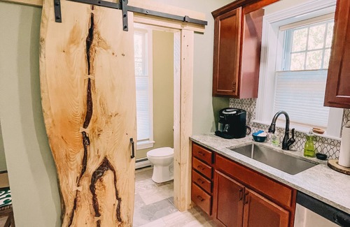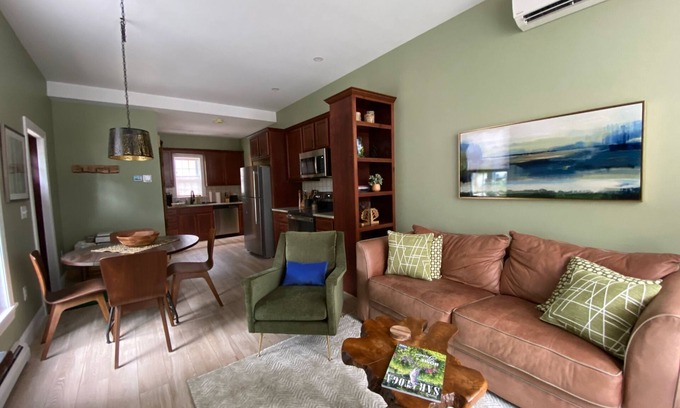 This space is designed around the theme of Earth, with it’s natural wood finishes, warm forrest-green colors, and cozy living room with big screen TV. Earth is 1 of 4 brand new luxury apartments within a renovated mid 1800s home. It includes 2 unique bedrooms and a pull out couch, 1.5 bathrooms with rainfall shower-head and tub, a dedicated workspace for business or remote learning, chef-ready kitchen, and an in-unit washer and dryer. With a private entrance, private outdoor space, and ample street parking around the building, this is the perfect location to enjoy all that Saratoga has to offer.