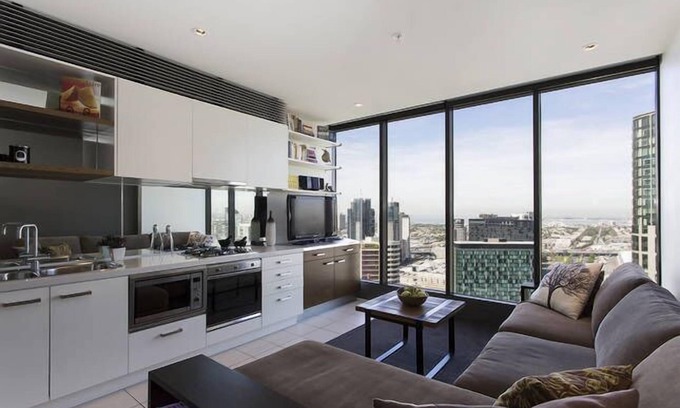 - Fully equipped open-plan kitchen and living area with floor to ceiling windows overlooking the city and Yarra River. Coffee and tea provided.