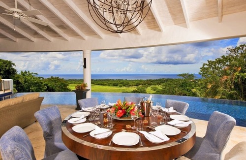 This luxury villa graces a ridge with breathtaking views of the Royal Westmoreland Golf Course and the Caribbean Sea. Offering seven spacious bedrooms, a separate guest cottage, and eight bathrooms, it's an ideal choice for large groups and families seeking the ultimate getaway in Barbados.