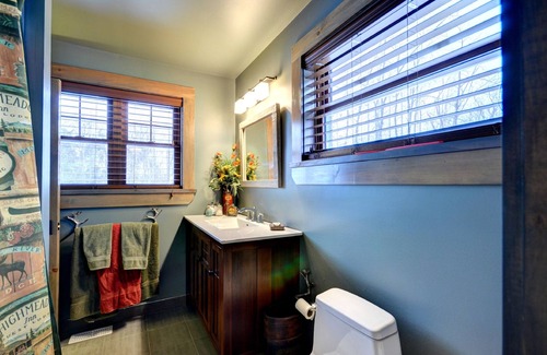 Loft Level " Cabin Cozy Bunk Room, Log bunk bed. 2 Queen Beds (Sleeps 2-4)$300 Ensuite Jack & Jill Bathroom with heated floors.