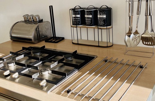 Dishwasher, microwave, oven, stove, refrigerator and Nespresso coffee machine.