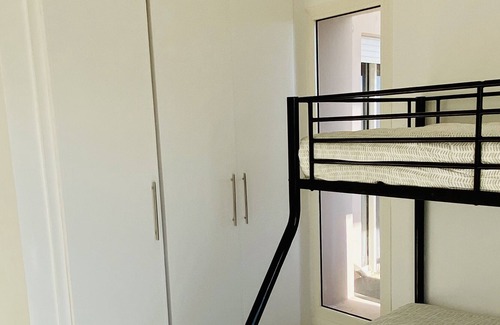 2nd bedroom has a bunk bed. Bottom bed is for two people and top bed for one person. The room also has a built-in wardrobe. Furthermore, all windows and balcony doors have shutters.