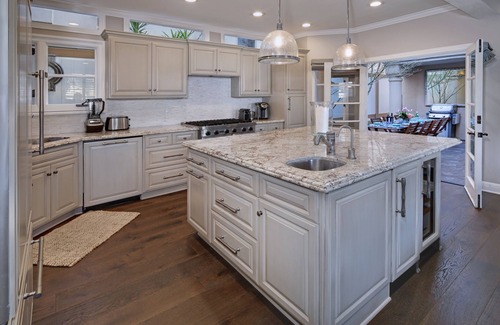 This beautiful corner home has an outside gas fireplace on a lovely, large patio, a perfect spot to connect over a glass of wine. If you want privacy, there is a second private patio off of the kitchen for quiet dining for eight. Along with the cozy outdoor fireplace, there are three indoor fireplaces. The kitchen boasts a large island, two sinks, a separate instant hot/cold filtered water faucet (great for an instant cup of tea or glass of water),high end appliances including a Viking 6 burner stove, Viking double oven, microwave oven, dishwasher, large refrigerator/freezer, warming drawer and wine refrigerator. Stools cozy up to the kitchen counter, and there is a beautiful table that can seat 8 in leather chairs. The living room, family room/kitchen and master bedroom all have large flat screen televisions.