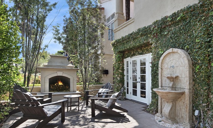 The front terrace has a fireplace surrounded by four Adirondack chairs and a romantic fountain. The patio off of the kitchen has a Weber BBQ and an outdoor table and chairs for eight. Both are private and gated.