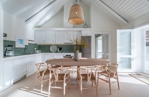 Cabana Pego Beach Comporta is situated on a 1100 square metre plot that borders directly on the Comporta nature reserve. The villa was designed by Jacque Grage in the typical Comporta style, with a thatched roof, white and blue whitewashed façade and large windows overlooking the pool. All bedrooms have access to the spacious terraces of the pool area and a French-style bathroom. The entire villa has underfloor heating and air conditioning.
