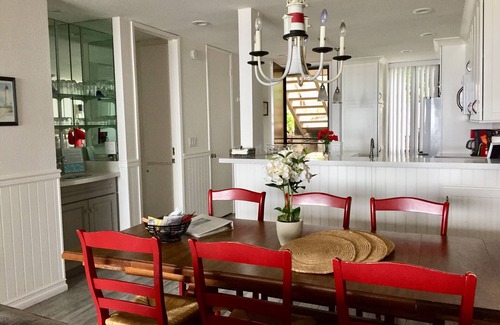 Experience the charm of a recently renovated kitchen featuring custom-made cabinetry, a spacious center island, and gleaming white Silestone countertops. The mid-century vibe is enhanced with a striking red tile backsplash and accents. This condo is equipped with top-quality utensils, appliances, cookware, and tableware that cater to the needs of both gourmet cooks and food enthusiasts. The kitchen's open-plan layout offers ample space for meal prepping while basking in the magnificent ocean view. The cheerful dining area is adorned with a six-seater table and chairs.