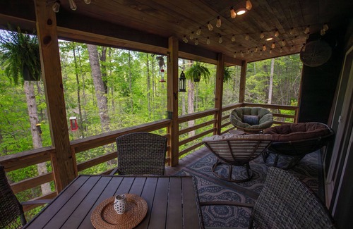 Secluded, yet not far off the beaten path, Hickory Hideout has three levels and offers you two on suites where we made every effort to make this cabin more than just home away from home. Each bedroom is furnished with a 43” Smart TV and plush queen beds for you relaxed and at ease after a day of fun. The main level includes the kitchen, half bath, laundry with front load washer and dryer, and a main living area. The living room is stately and inviting with its marvelous cathedral ceilings and double sliding glass doors for picturesque views of the secluded mountainside and is situated with fine leather furniture, fur rug, fireplace and 50” Smart TV. The lower level encompasses a space that can be used as a private master suite or shared living space including a bedroom, full jack and jill bath with tile surround shower and living room with a full size Lazy-boy sofa sleeper. The open air covered deck is off the main level with areas for lounging and dining. There is also a partially screened in patio in the lower level that leads to the outdoor fire pit where you can enjoy the serenity of a warm, crackling fire under the illumination of the ambient lighting.