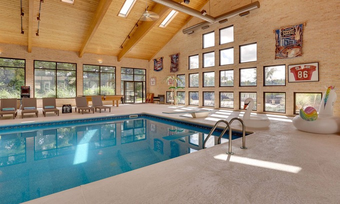 Welcome to this luxurious vacation rental in Canfield! This home is ideal for large groups and families, boasting 8 bedrooms, 3 full bathrooms, 2 half bathrooms, and a 4,000-square-foot natatorium with a heated pool. Enjoy the multiple entertainment spaces, play a match on the private tennis court, or simply relax on the 5-acre property with a pond. Movie buffs will love the theater room, and the wet bar is ideal for socializing — this gem truly offers endless options for leisure and fun!