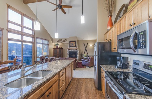 The two bedrooms with queen beds share a full hall bathroom. The room at the end of the hall offers two sets of bunk beds (both twin over twin) and has an en-suite bath. The primary suite is sure to please. Complete with a king size bed with memory foam topper and plenty of storage space, it has a five piece en-suite bathroom. There’s also a Pack-n-Play for those traveling with future skiers and a portable twin mattress in the closet. You will find two more rooms with queen beds in each. Full restroom in hallway and set of washer and dryer. Full kitchen with all the appliances you need and a big beautiful living room with large TV and balcony.