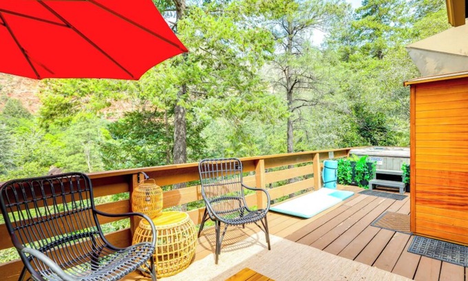 Experience Sedona’s canyon beauty at this luxury creek home rental. Enjoy mountain views & the sounds from Oak Creek on the patio while eating, relaxing, or enjoying the private hot tub & sauna. Inside, unwind by the fire with views out every window. Explore private creek access for fishing or private trail access for hiking. Don't miss downtown Sedona, West Fork Trail, Slide Rock, & Cottonwood wineries. Ideal for a romantic retreat or family & friends. There is something for everyone at this luxury creek home.