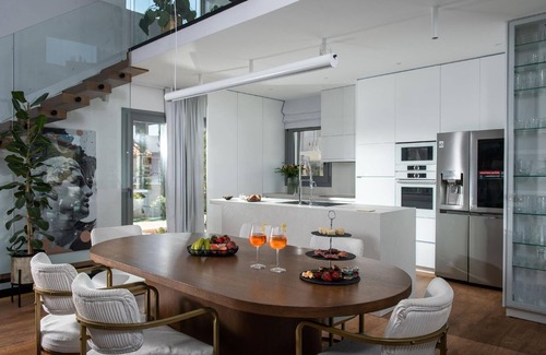The residence is a luxury designed eco-friendly environment of 340 sq.m located in Hersonissos near Heraklion, at the centre of the island of Crete. Walking along the street and down the path is one of the most beautiful beaches where you can swim at the warm/crystal clear water of the Mediterranean Sea.