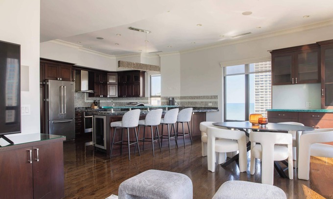 Located in a full-service building with elevator access and just steps from Michigan Avenue, your penthouse apartment was professionally designed, sleeping up to 12 people and is perfectly situated for groups, families, and those traveling for work. Everything flows around the spacious and open living room and kitchen which have some of the most breathtaking views of all of Chicago and the Lake, and features high-end cooking appliances and designer level finishes, which creates a unique environment for entertaining and gathering with your group.