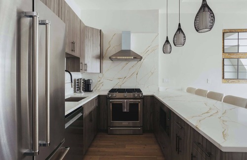 sophisticated living room and chef's kitchen, offering charming exposed brick walls that bring warmth and character to the space...it's perfect for entertaining.