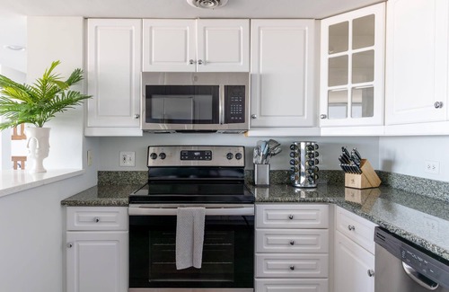 Attached to the living area, the high end designer quality chef's kitchen is outfitted with stainless steel stove, stainless steel oven, restaurant sized refrigerator and freezer, plenty of cabinetry, plates, cups, and cutlery in addition to state-of-the-art kitchen appliances including a Nespresso coffee maker, amongst others.