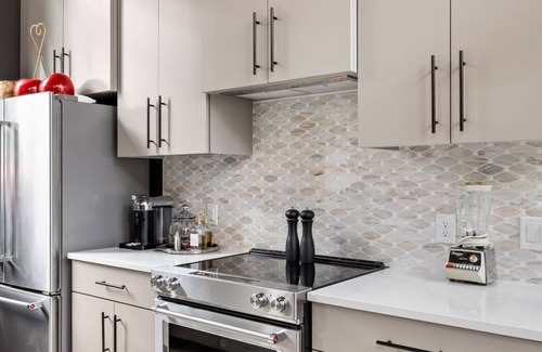 Fully equipped kitchen with modern appliances and a convenient half bath.