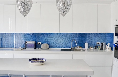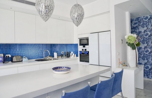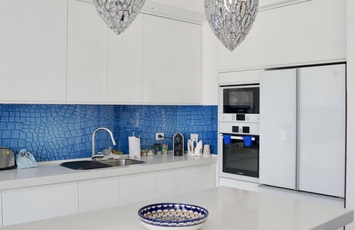 An American kitchen equipped with a dishwasher, a drinking water machine, a vitro electric stove, a microwave oven, an oven, an American refrigerator, a Nespresso coffee machine and all the necessary kitchen utensils A large sofa , a flat screen TV, a large dining room table.