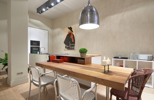 Upon entering the flat we find a spacious hall. From the hall we access the spacious living room with Smart TV, two large L-shaped sofas, a side table and three balconies overlooking San Fernando street with privileged views of the old Royal Tobacco Factory of Seville, currently the building of the University of Seville. T The living room has a dining area with seating for four people that divides the living room area and the fully equipped modern kitchen. The living room has also a large desk ideal for thouse that need to work during their stay in Seville..
