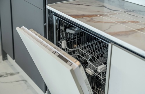The state-of-the-art kitchen is a chef’s dream, boasting sleek cabinetry, top-of-the-line appliances, and exquisite marble countertops. It’s fully equipped with everything you need to prepare gourmet meals. The modern design and high-end finishes make this space as beautiful as it is functional.