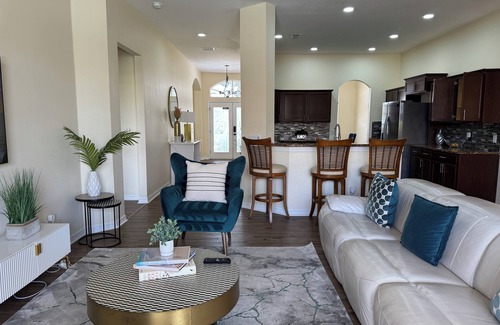 Charming 4-bedroom house has recently been renovated and features modern amenities. Located in a peaceful neighborhood, it boasts a beautiful backyard pool area. The fully equipped kitchen has everything you need to cook, so you don't have to worry about packing any kitchen supplies. This cozy home is perfect for your stay as it offers both comfort and convenience.