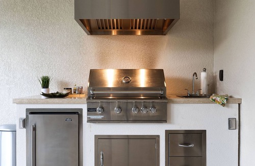 • Outdoor kitchen with grill, fridge, fireplace & 60” Smart TV