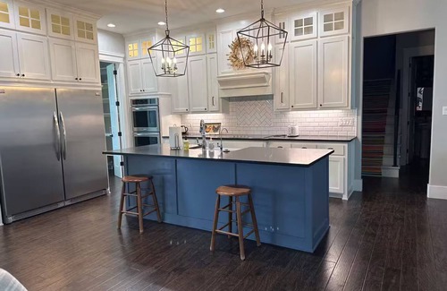 With 4 spacious bedrooms and 3.5 bathrooms, the home comfortably accommodates large groups. The luxurious master suite includes a spa-like en-suite bath and private sitting area. Each room is thoughtfully styled with high-end finishes, plush bedding, and farmhouse flair.