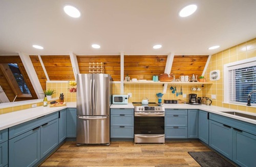 Our 1960’s "A" maintains its midcentury style with luxurious & modern amenities: barrel sauna, private hot tub, & chef's kitchen to ensure an exceptional stay and relaxation. From the beautiful design & vaulted ceilings to the Scandinavian fireplace this home aims to please, be it a cozy night in or a day at the sandy beach. Just a short stroll to the Pacific Ocean, shops & foodie restaurants. Everything is well appointed with our guests in mind.