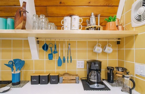 AwayFrame is pet friendly and outfitted with food and water bowls, treats, baggies, dog blankets, convenient dog door, fully fenced yard and a midcentury dog couch. Only the best for our furry guests!
