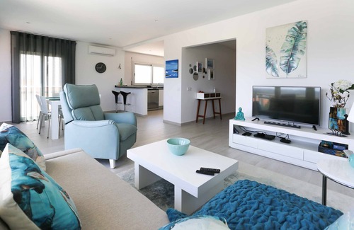 Luxury apartment with communal heated swimming pool on solar energy. Sleeps up to 6 guests, one bedroom with double bed and one with 2 single beds. Living room with pull-out sofa (sleeps 2 people). All rooms have air-conditioning/heating. Large bathroom with tub/shower. 2 balconies, one offering gorgeous views of the bay. Fully equipped open kitchen.10 min walk to the beach. All major attractions are a short drive away. We offer complete beach gear: chairs, umbrella, beach towels, cooler.
